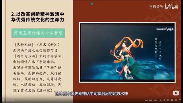 微课由施华东老师指导,曹嘉怡同学讲述,以图文并茂的形式,讲述了一名致力于讲好中国故事的大学生对中华文化代代相传的愿景与想法。作品通过诗词歌赋对《唐宫夜宴》《洛神水赋》两场节目进行引用与描述,展现了对中华传统文化的创造性转化与创新性发展正面典型。以《三体》为例阐述了在国际文化交流中如何以“求同存异”方式传播中华文化,抒发了新时代大学生对传承好中华优秀传统文化的向往。