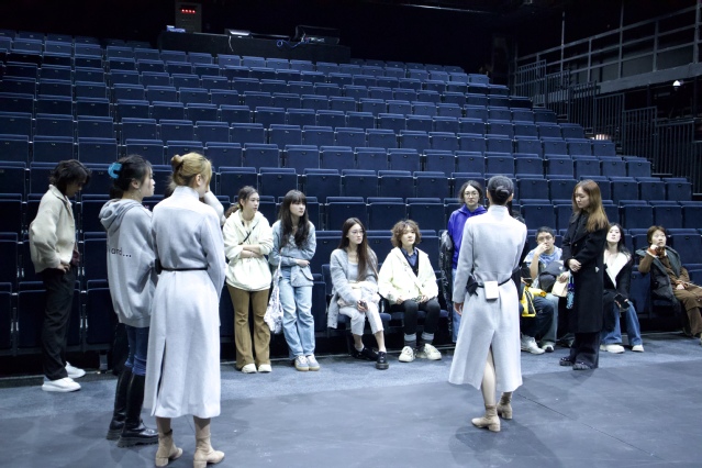 参观环节,工作人员带领同学们依次参观了上话展厅、艺术剧院、休闲区域、戏剧沙龙和D6空间,了解上海话剧艺术中心的历史沿袭、经典剧目的舞美服装道具、各剧场的功能性等,学习导演如何在商业性的剧场里利用演员优势排演剧目,达到艺术化与商业化的融合。本次活动中同学们还观摩了导演系PT专家、硕士生导师、国家一级导演王晓鹰执导的《千里江山图》演出合成现场。