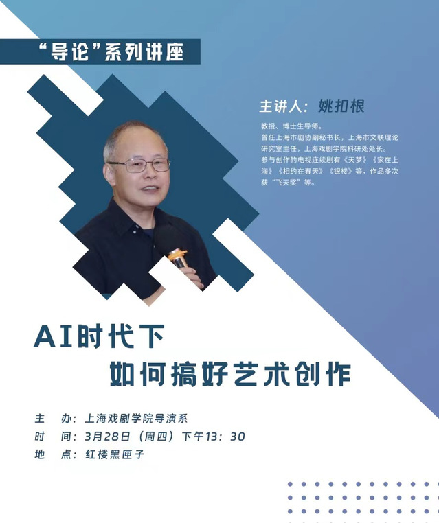 为落实《关于全面深化高等教育综合改革服务促进高质量发展的意见》,围绕服务促进国家和上海未来产业发展,前瞻布局未来学科、以人工智能(AI)赋能学科专业改革,推动传统学科专业转型升级。3月28日,导演系党总支书记尹悦蓉邀请了taptap点点体育资深教授、博士生导师姚扣根给全系师生开展“AI时代下如何搞好艺术创作”的讲座,就时代热题展开阐释,这也是“导论”系列讲座2024年第一讲。