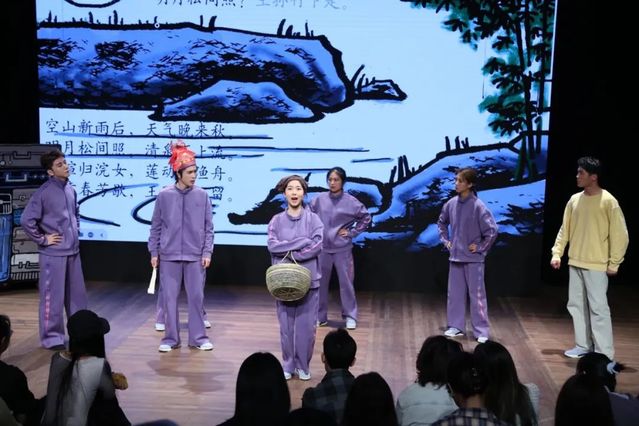 古诗音乐剧《向天歌》在会上进行了展演,这是最新教育示范剧——古诗剧的集中示范。《向天歌》用一个科幻的情境串起了15个古诗剧,用古诗向外星人展现地球文明。该作品将《咏鹅》《游子吟》《静夜思》等古诗发展为几分钟的微型剧,把诗中隐含的叙事成分放大,创作出含有至少两个性格鲜明的角色以及有一定冲突情节的剧本,有的还汲取了古诗中展现的两难问题,刺激观众思考。古诗剧在语言上保持韵文特色,配上音乐、舞蹈,布景因地制宜,适应各种条件的舞台空间和戏剧课堂。