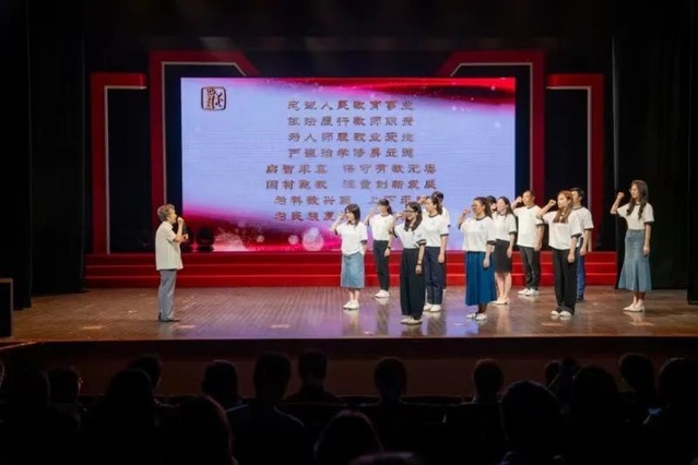 如果说2024级音乐剧专业新生深情演唱《因为你》《夜空中最亮的星》等歌曲,是学生对于教师的赞美,那么播音主持专业骨干教师朗诵的古文《师说》,则是教师对于自身的一种高度自觉:立德修身、立学敬业,既做经师,更为人师,做教书育人的“大先生”,做“四有”好教师的践行者。主题活动中,最令人感动的还是学生代表深情讲述身边老师的“师德故事”,情真意切、朴实动人,而故事中的老师们也热情回应了一个终身探索的问题:我为什么当教师?