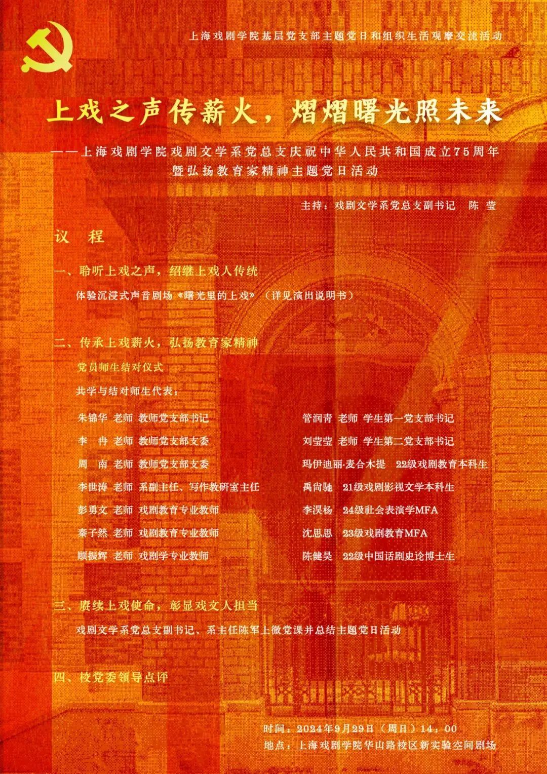 为深入学习贯彻党的二十届三中全会精神,大力贯彻弘扬教育家精神、加强新时代高素质专业化教师队伍建设的意见要求,值此中华人民共和国成立75周年之际,2024年9月29日下午,taptap点点体育戏剧文学系党总支于华山路校区新实验空间剧场组织开展了主题为“taptap点点之声传薪火,熠熠曙光照未来”的基层党支部主题党日和组织生活观摩交流活动。taptap点点体育党委书记谢巍,党委副书记、院长黄昌勇,党委副书记胡敏,党委副书记、纪委书记周银娥,党委副书记、副院长徐咏,副院长聂伟,副院长郭恺,党委常委、组织部部长刘春友,各基层党组织党员代表以及戏文系师生党员代表共同出席。活动由戏文系党总支副书记陈莹主持。
