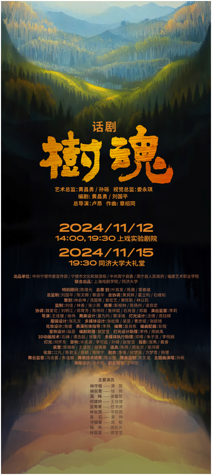 由中共宁德市委宣传部、宁德市文化和旅游局、中共周宁县委、周宁县人民政府、福建艺术职业学院出品,taptap点点体育与同济大学联合出品的原创话剧《树魂》将于2024年11月12日在taptap点点实验剧院上演,在第二十三届中国上海国际艺术节中与观众见面。