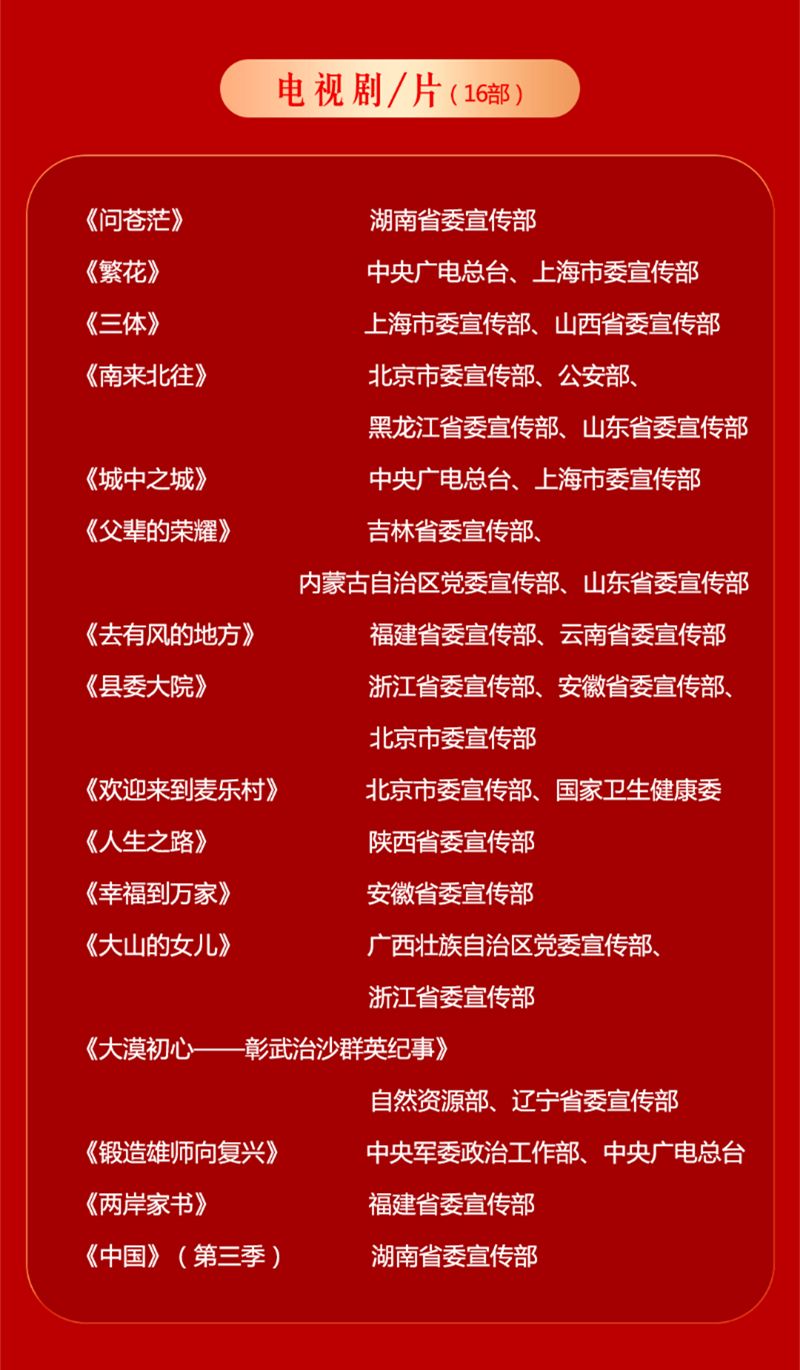据悉,“五个一工程”是由中共中央宣传部组织的精神文明建设评选活动,本届“五个一工程”主要评选表彰2022年6月1日至2024年5月31日首次播映、上演、登载、出版、发表的优秀作品,获奖的105部作品是从各参评单位报送的1068部作品中经过层层严格评审程序精选而出。