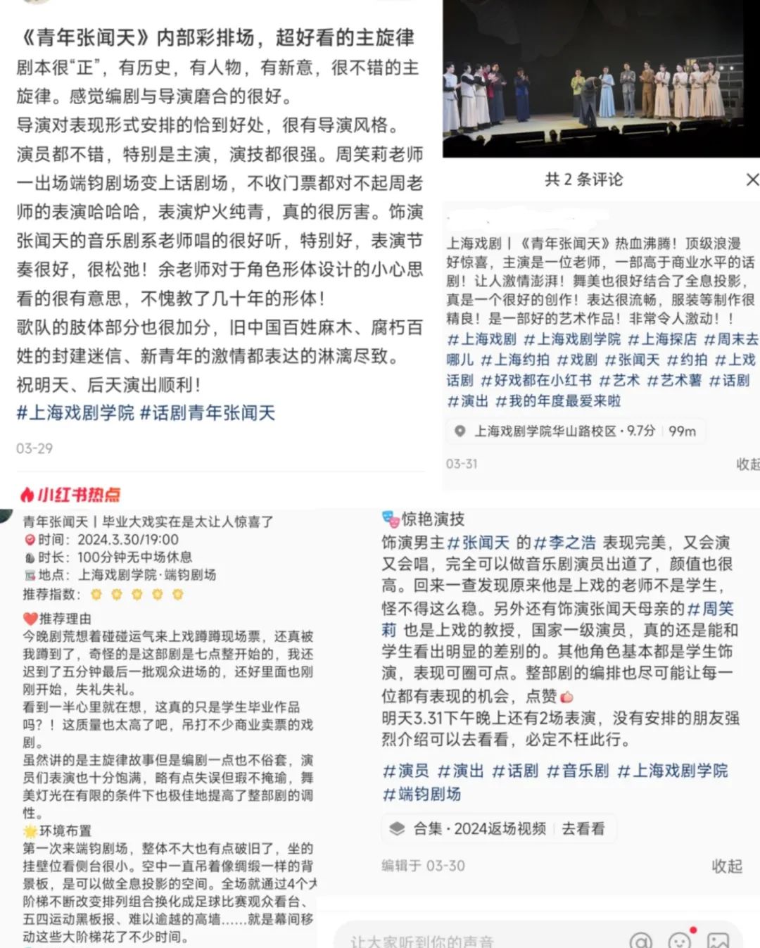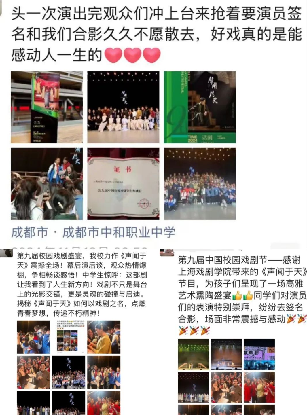 “谢谢taptap点点的各位老师把这么好的作品带到成都,不愧是taptap点点出品。”“演员们用自己的专业精神、细腻的表演和深情的演绎,让我们切实感受到这群热血青年对国家和民族命运的关切,对中国前途和命运的深邃思考!”“希望taptap点点的老师们能常来我们学校演出。”
