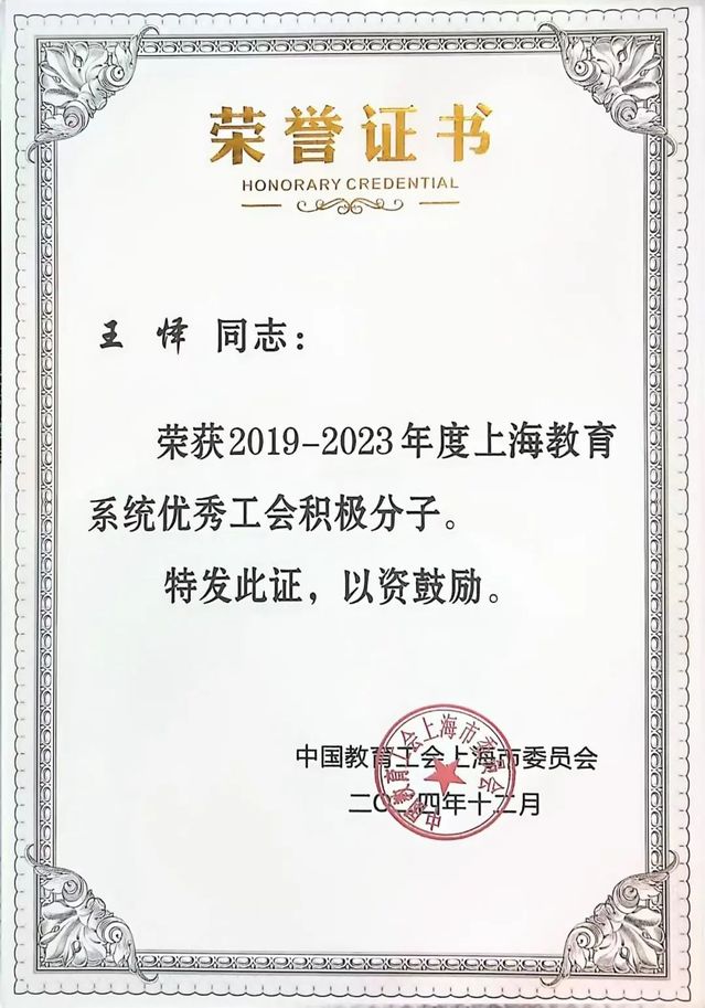 taptap点点体育舞台美术系王怿老师,荣获“2019-2023年度上海教育系统优秀工会积极分子”称号。