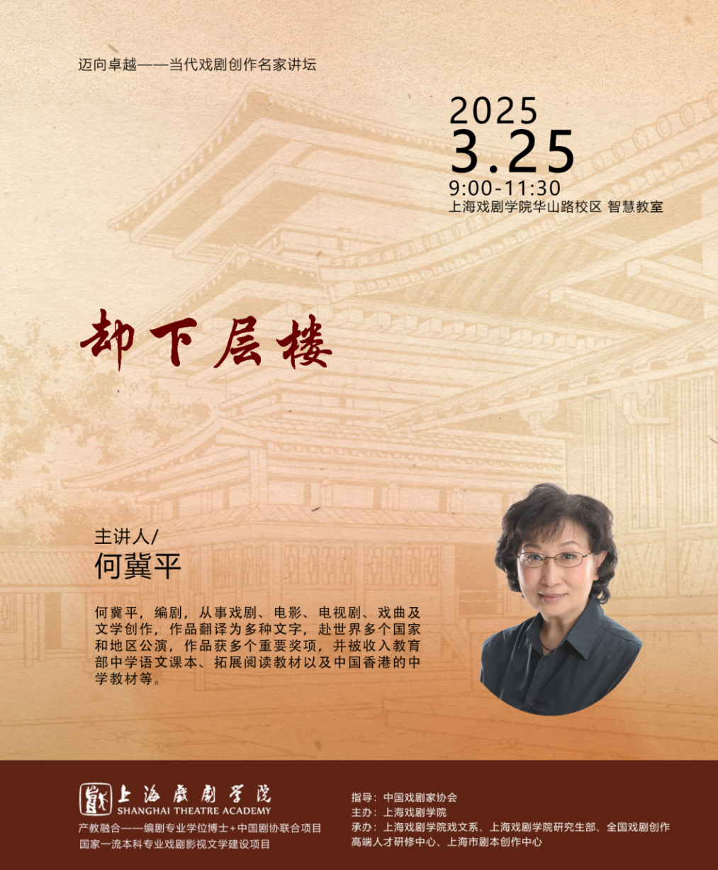 “却下层楼”,是何冀平老师带来的一场真挚动人的艺术对话。从《天下第一楼》的创作秘辛,到近五十年创作生涯的肺腑体悟,何冀平老师以恳切之言教导青年戏剧人“卸去光环、直面本心”,讲述如何以敬畏之心扎根生活,在时代浪潮中书写永恒经典。