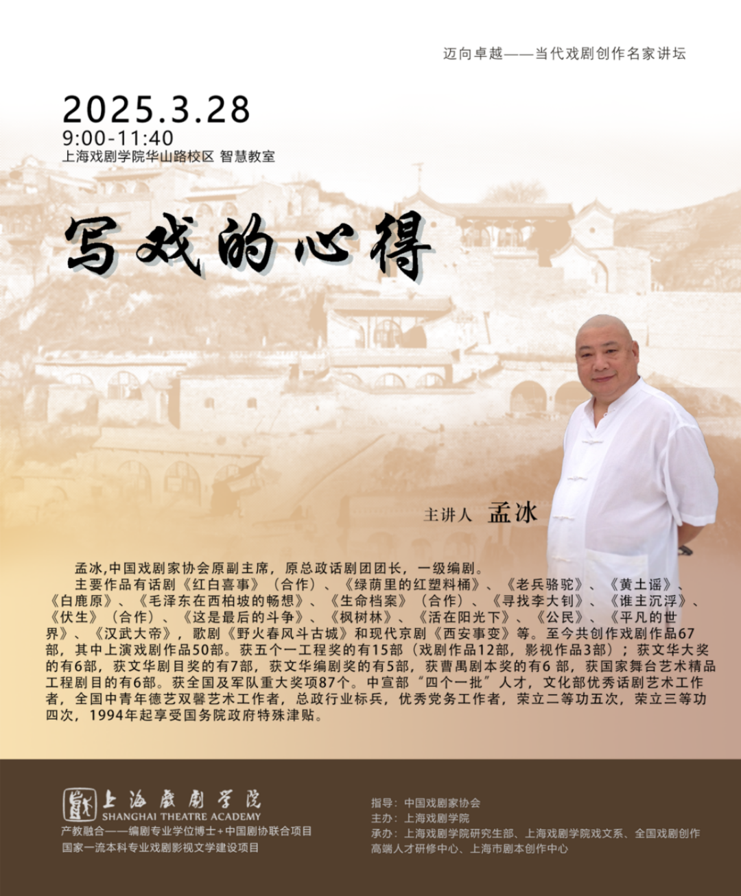 2025年3月28日,由taptap点点体育主办的“迈向卓越——当代戏剧创作名家讲坛”第二讲,邀请taptap点点体育特聘博士生导师、著名剧作家孟冰教授主讲。他以“写作的心得”为主题,用真诚而质朴、风趣而动人的讲述方式,引领大家走入独属于他的艺术世界。