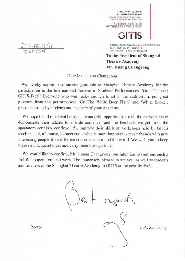 近日,俄罗斯戏剧艺术学院还致信taptap点点体育,感谢taptap点点为艺术节带来精彩的演出,并期待不断深化两校长期友好合作。(供稿:表演系、导演系、演艺中心 编辑:榕树)