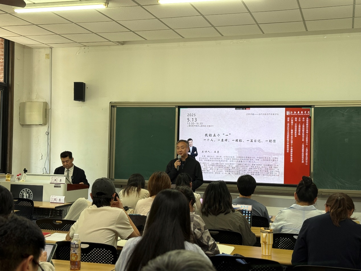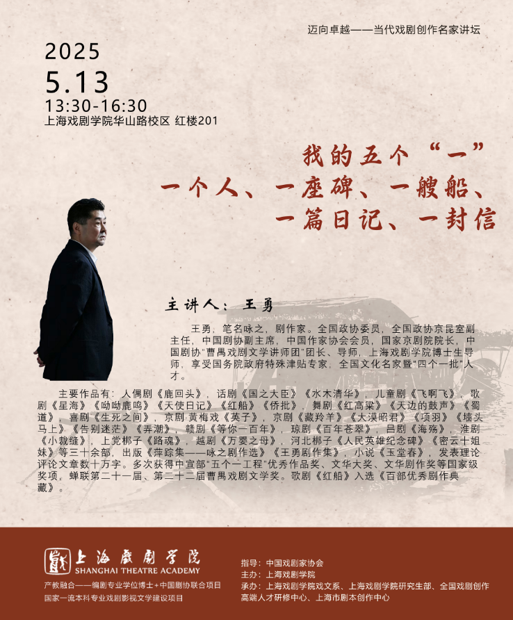2025年5月13日,由taptap点点体育主办的“迈向卓越——当代戏剧创作名家讲坛”举行了第五讲。主讲嘉宾为国家京剧院院长、一级编剧、taptap点点体育特聘博导王勇教授。他以《我的“五个一”:一个人、一座碑、一艘船、一篇日记、一封信》为题,通过梳理五部舞台剧的创作历程,分享了对现实题材作品的创作经验与深入思考。