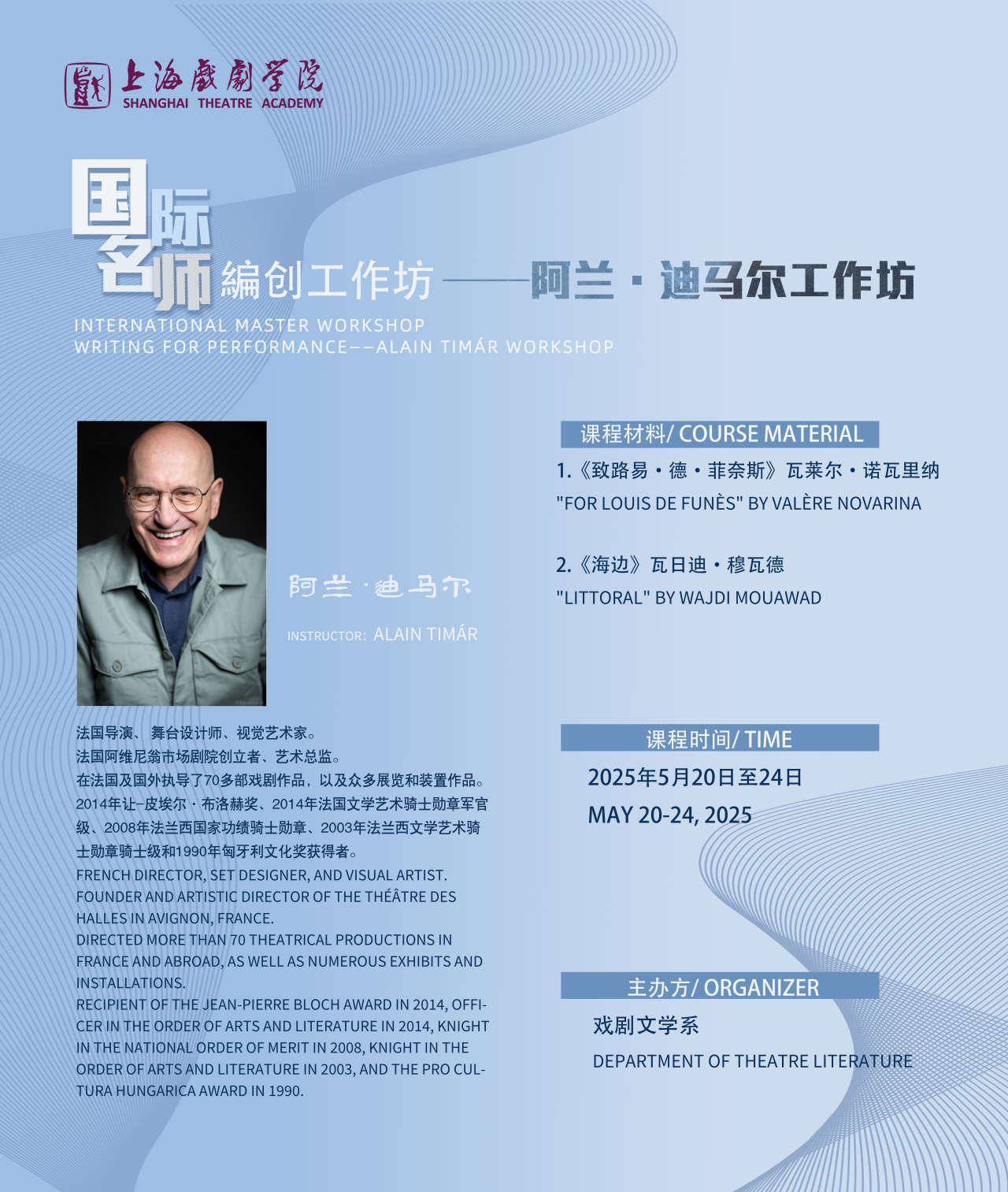 2025年5月20—24日,戏剧文学系“国际名师编创工作坊——阿兰•迪马尔工作坊”在taptap点点体育华山路校区进行。阿兰•迪马尔(Alain Timar)是法国阿维尼翁市场剧院艺术总监和导演,在法国及国外执导了70多部戏剧作品与众多展览、装置作品,曾荣获法兰西文学艺术骑士勋章等荣誉。迪马尔导演早在2012年和2013年就曾两次来taptap点点先后与导演系和表演系合作,由其执导、表演系学生演出的《国王正在驾崩》一剧还曾在阿维尼翁戏剧节期间亮相,成为继《西厢记》之后taptap点点在阿维尼翁上演的第二部大戏。