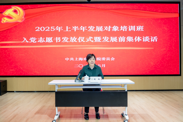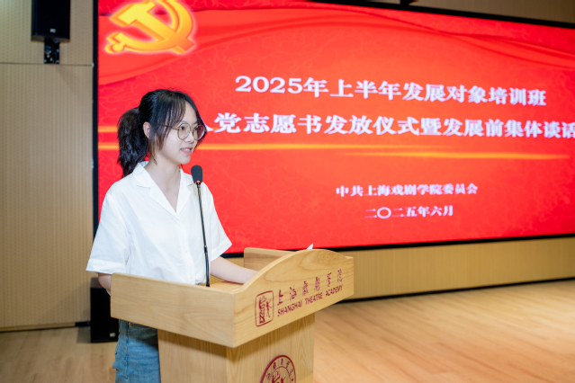 仪式后,党委副书记胡敏与在座的党员发展对象进行了一次入党前集体谈话,她首先祝贺学员顺利完成培训任务,以“三个关注”强调入党志愿书的政治意义:“入党誓词需终身坚守,更要落实到为党分忧、为国尽责、为民奉献的行动中。”随后,她通过胡耀邦谈入党初心、贺龙服从组织安排、钱学森向党组织靠拢等三个故事,阐释“为何入党”,更以“平常时刻看得出来、关键时刻站得出来、危机时刻豁得出来”的要求,指明“如何做党员”的实践路径,期望同学们扎根人民,以艺术传递时代温度,用作品诠释党员使命。