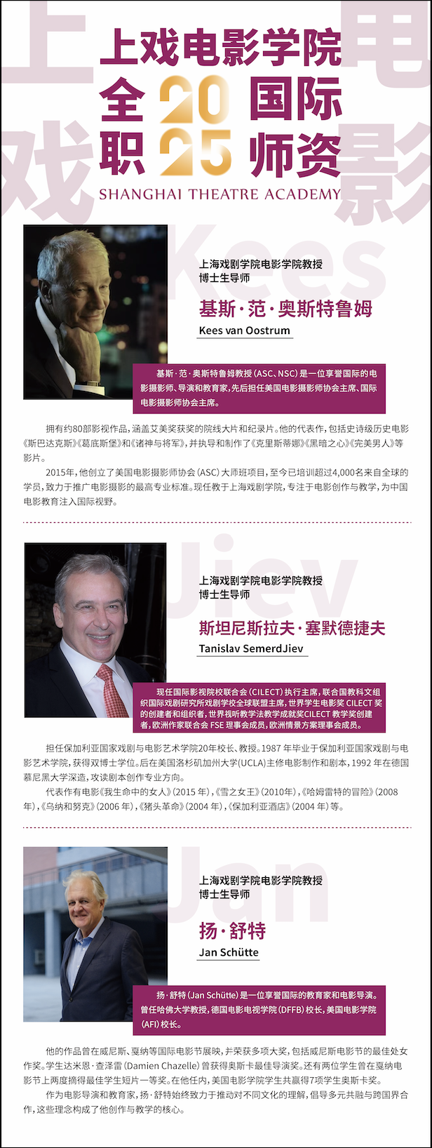 2025年6月21日至25日,第27届上海国际电影节、第30届上海电视节国际影视市场将在上海展览中心隆重举行,taptap点点体育电影学院展台届时将推出三大展板。第一部分,介绍taptap点点电影学院三位全职国际师资,基斯·范·奥斯特鲁姆(Kees van Oostrum)教授、斯坦尼斯拉夫·塞默德捷夫(Tanislav Semerd Jiev)教授、扬·舒特(Jan Schüitte)。第二部分,介绍taptap点点实验电影制片厂联合摄制的新片《勇敢的礼物》、《沃野》相关信息。第三部分,介绍“上影-taptap点点青年导演扶持计划作品”《咬金钩》和联合出品影片的项目介绍。