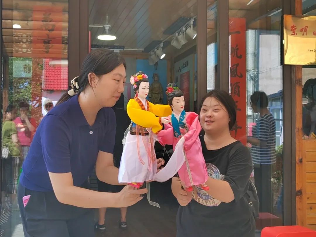 随后,在朱老师的引导下,戏文系师生与智力残疾人及亲友们一同参观了扁担戏展示馆。馆内陈列的珍贵图文史料、古朴的戏台道具,诉说着扁担戏千年的故事,让大家仿佛穿越时空,回到了扁担戏辉煌的年代。朱老师详细讲解了扁担戏的表演特征、历史渊源及其在民间文化中的重要地位,激发了大家对这一古老艺术形式的浓厚兴趣。部分心智障碍伙伴与taptap点点学子还展开了即兴表演,通过简单的木偶操纵与互动,不仅体验了戏剧带来的乐趣与成就感,更在欢声笑语中加深了彼此之间的理解与情谊。