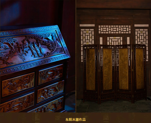在非遗文化的活态传承与创新表达方面,剧目做出了卓有成效的探索。创作团队独具匠心地将两项国家级非物质文化遗产——“东阳木雕”与“苏绣”深度融入剧情肌理与舞台视觉呈现之中。