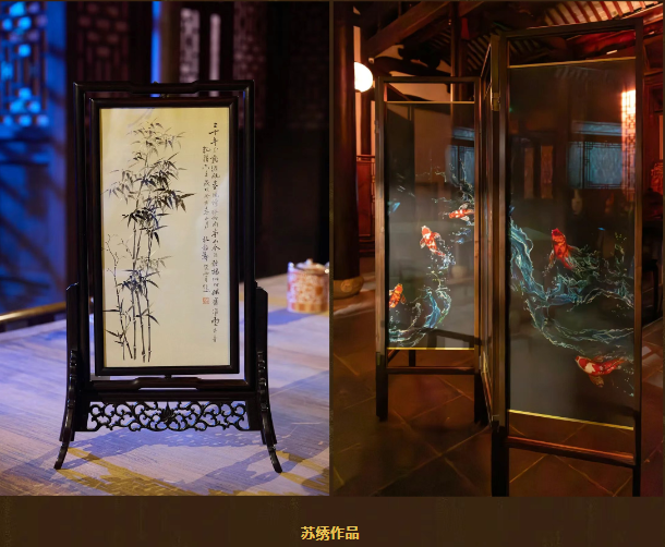 气势恢宏、刀法精湛的“东阳木雕”艺术,与剧中代表商业力量与时代宏图的“商会”主线相呼应,通过精心复刻的议事图景与沙船商帮的辉煌历史,生动再现了当年民族商业的磅礴气象;而针法细腻、意境悠远的“苏绣”艺术,则与展现戏曲传承与个人命运的“戏班”主线紧密契合,与剧中婉转悠扬的昆曲表演相得益彰,共同彰显出传统戏曲艺术含蓄内敛、韵味无穷的美学神韵。