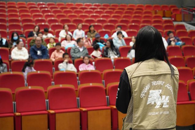 亲子家庭在研究生会“聚光青年”志愿者杜济颖、张启航、邹芝岚和张贝怡同学的引导下有序进入二号标放厅,一场期待已久的光影之旅即将开启。随着灯光渐暗,由电影学院学生拍摄的《恐龙蛋事件》缓缓放映,奇幻的情节、细腻的镜头、充满想象力的表达,让孩子们时而睁大眼睛惊叹,时而小声与身边的家长分享感受,家长则静静陪伴,从孩子专注的神情中,捕捉着艺术启蒙的珍贵瞬间。