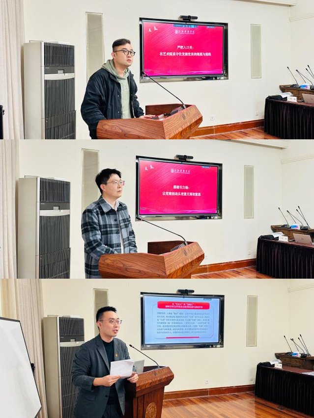 “朋辈引路”环节生动呈现了“组织部命题—实践者答题”的精准赋能模式。党委组织部围绕发展党员工作的关键维度,预先设定了“规范筑基”“创新赋能”“价值引领”三大方向,并细化了每位老师的分享命题与核心要点。三位刚从学生支部书记岗位转岗的青年干部,分别“领题”并结合一线实践展开深度“解题”。表演系(含音乐剧中心)党总支副书记、组织员夏逸石紧扣《严把“入口关”:如何在个性化突出的艺术院系守住发展党员的规范与底线》这一命题,分享了在平衡原则刚性与育人温度、破解艺术生发展党员“材料规范难题”等方面的实践案例。校团委书记李宗禹围绕命题《搭建引力场:让党建活动从有意义到有意思》,结合一系列“破圈”案例,给出了将“硬”的政治要求转化为青年学生喜闻乐见、发挥专长的“软”活动载体的“金点子”;宣传部青年干部张兴峰则从舞蹈学院典型人物故事入手,回答了《从“艺术人”到“党的人”:如何引导艺术生党员完成身份认同与价值升华》这一命题,以生动的视频图文讲述了一名优秀青年党员从专注于“小我”技艺到树立“大我”担当的蜕变历程。
