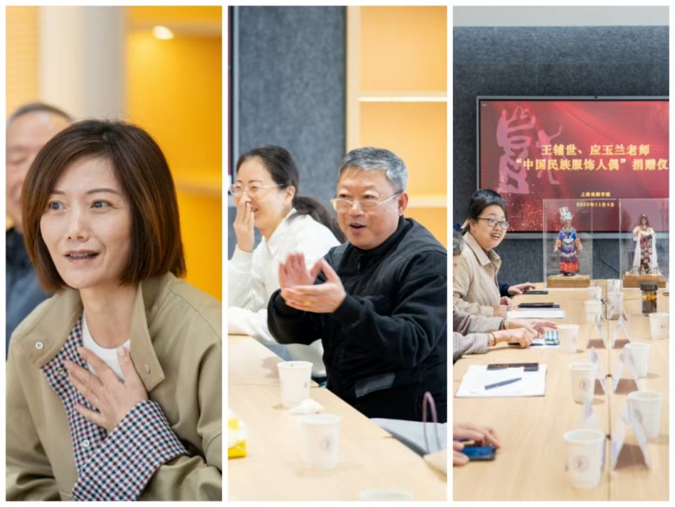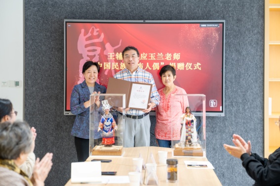 捐赠仪式上,校党委副书记胡敏代表学校对王辅世、应玉兰夫妇的儿子、儿媳表示了最诚挚的感谢。胡敏副书记回想起当年自己在主持院志编制工作的时候,就已经从文字上了解到两位老教师制作人偶的故事,那时心中充满了好奇。今日见到实物,觉得每一件都精雕细琢、栩栩如生,令人叹为观止。她认为这批人偶是一份承载着艺术生命和教育情怀的艺术珍品,每一处细节都体现了心细如发的专业精神、工匠精神。民族服饰生动地展现了我国各民族文化的独特魅力,承载着两位老教师对民族文化的深情守望。