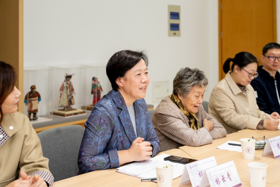 接下来进入交流发言阶段,学校原党委书记戴平老师深情地说到看到这些人偶实物,就好像又看到了应老师,王老师两人,一个在做模子,另一个在那里一针一线缝衣服的情景。今朝睹物思人,物是人已非,难过得眼泪都要流下来。戴老师回忆当年王辅世老师去世的时候,她亲自撰写了悼词,悼词中有一句话“春蚕到死丝不尽”。她当时将“春蚕到死丝方尽”改成“丝不尽”用意就是指王辅世老师为中华各民族传统服饰的传承耗尽了一生心血,而王老师所做的一切日后必将有后人传承下去。她还讲述了当年两位老师历尽千辛万苦深入少数民族地区实地调研才能制作出与这些各民族风土人情相符的人偶,两位老教师的研究也填补了相关领域的空白。戴老师感慨地说,今天的捐赠也是为这些人偶找到了最好的归宿。相信我们学校一定会保护好、使用好这批人偶,在教学、科研领域发挥更大的作用,同时也会将两位老教师的人格力量和精神向年青学子进行广泛宣传。