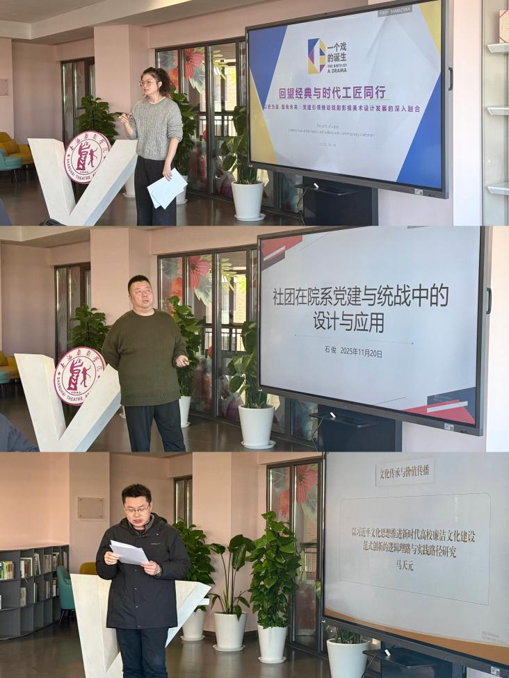聚焦“文化传承与价值传播”,马天元以习近平文化思想为指导,探索新时代高校廉洁文化建设范式创新,思考如何突破浅表化困境;石俊结合艺术院校专业特色,分享基层党组织在统战与社团工作中的创新拓展;石昊则从历史视角出发,探讨还原历史舞台、开发文创、引入AI活化校史等党建引领推动戏剧影视美术设计发展的实践路径。