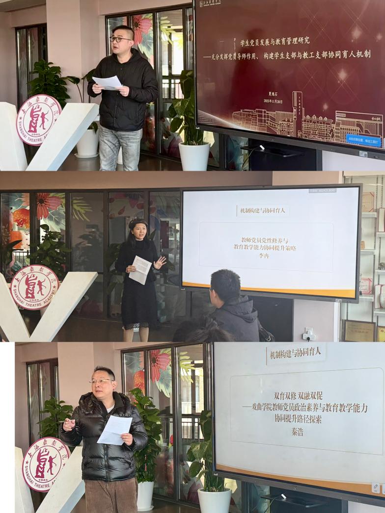 在“机制构建与协同育人”议题中,秦浩以《双育双修 双融双促》为题,聚焦戏曲学院教师党员政治素养与教育教学能力协同提升,直指“评价体系不协同”“教师参与动力不足”等难点;李冉围绕教师党员党性修养与教育教学能力协同提升,提出“党性靠自觉还是靠培养”“业务与党建时间冲突如何调节”等深层疑问;夏逸石则就学生党员发展与教育管理,探讨党员导师的作用发挥及师生支部协同育人机制的构建路径。