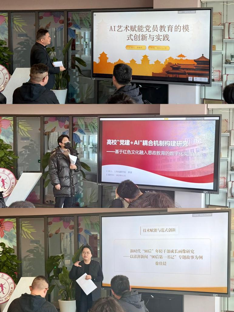 围绕“技术赋能与范式创新”议题,黄暾炜在《AI艺术在党员教育培训中的应用探索》中分享了AI绘画还原党史、AI音乐创作红歌的实践思路,并提出技术安全、艺术表达与接受偏差等现实难题;薛嘉在《高校“党建+AI”耦合机制构建研究——基于红色文化融入思政教育的数字化实践创新》中提出“内容生产—智能评估—精准传播”的全链条构想,并指出红色资源碎片化、算法导向难追溯、育人实效难量化等挑战;徐佳晨则从现象、方法论、实践价值三个维度探讨90后干部特征及其与大学生教育的关联。