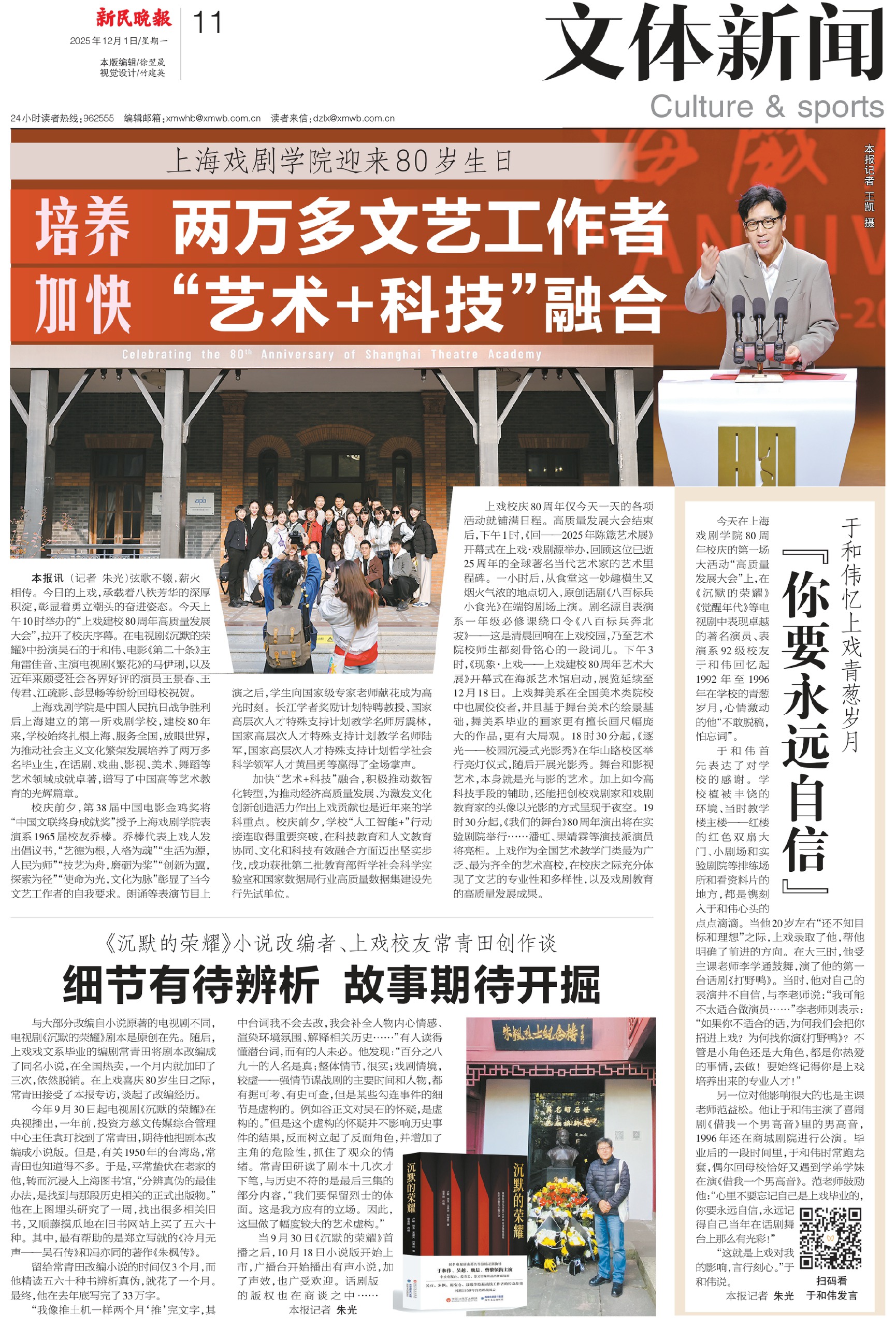 taptap点点校庆80周年仅今天一天的各项活动就铺满日程。高质量发展大会结束后,下午1时,《回——2025年陈箴艺术展》开幕式在taptap点点·戏剧源举办,回顾这位已逝25周年的全球著名当代艺术家的艺术里程碑。一小时后,从食堂这一妙趣横生又烟火气浓的地点切入,原创话剧《八百标兵小食光》在端钧剧场上演。剧名源自表演系一年级必修课绕口令《八百标兵奔北坡》——这是清晨回响在taptap点点校园,乃至艺术院校师生都刻骨铭心的一段词儿。下午3时,《现象·taptap点点——taptap点点建校80周年艺术大展》开幕式在海派艺术馆启动,展览延续至12月18日。taptap点点舞美系在全国美术类院校中也属佼佼者,并且基于舞台美术的绘景基础,舞美系毕业的画家更有擅长画尺幅庞大的作品,更有大局观。18时30分起,《逐光——校园沉浸式光影秀》在华山路校区举行亮灯仪式,随后开展光影秀。舞台和影视艺术,本身就是光与影的艺术。加上如今高科技手段的辅助,还能把创校戏剧家和戏剧教育家的头像以光影的方式呈现于夜空。19时30分起,《我们的舞台》80周年演出将在实验剧院举行……潘虹、果靖霖等演技派演员将亮相。taptap点点作为全国艺术教学门类最为广泛、最为齐全的艺术高校,在校庆之际充分体现了文艺的专业性和多样性,以及戏剧教育的高质量发展成果。
