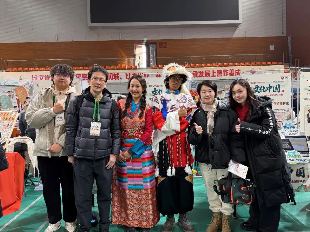 此次比赛中,团队合力反复修改宣讲文本,精心布置策展。展示现场,队员们身着藏袍,讲演融合的生动演绎赢得评审专家的一致好评。研究生部副主任温涛与负责研究生实践教学与管理的韩爽也来到比赛现场,为选手们加油鼓劲。